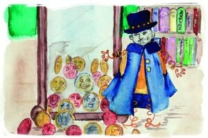 „Das hast du goldrichtig erkannt, lieber Rosso“, stellte Herr Goldmund zufrieden fest. „Die Menschen könnten sich beim Tauschen dauernd nicht darüber einigen, wie viel etwas wert ist im Vergleich zu etwas anderem! Woher sollen die Leute zum Beispiel wissen, wie viele solcher Glitzer-Kreisel ein Kühlschrank wert ist?“