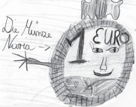 Seither weiß ich, dass Jahr für Jahr viele Euro-Münzen-Kinder in dieser sagenumwobenen Schule spielen, lernen und nachts in einem dicken Münzen-Sammler-Buch schlafen. Tag und Nacht sind die Münzen-Kinder dort beieinander. Ihr geräumiges Schulzimmer ist tatsächlich eine Welt für sich, in der es tausend spannende Dinge zu entdecken gibt! Auf einem großen Tisch üben die Münzen-Kinder am allerliebsten, so lange wie möglich auf ihrem Rand zu rollen, ohne dabei umzukippen. Ihr Lehrer gibt ihnen dafür einen Schubs, damit sie in Schwung kommen. Während die Münzen-Kinder auf dem Tisch auf ihren Schubser warten, beobachten sie durch das Fenster, was um den Turm herum passiert. „Guckt mal da: der Skiläufer! So viele Kurven, wie der fährt, möchte ich auch mal rollen können …“, ruft im Winter eine der anderen zu.