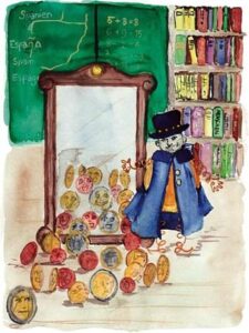 Am Rande der Stadt Numismatika, im Wald, dort wo die Hügel allmählich höher werden, fließt in vielen Kurven der Silberbach. An seinem Ufer verläuft eine holprige Straße. Fährst du auf ihr, so siehst du bald, dass sie zum Gipfel des Berges führt. Dort erhebt sich, umgeben von Kiefern, ein sandfarbener runder Turm. Schon von Weitem leuchtet seine Kuppel. Wenn du näher kommst, siehst du, dass diese Kuppel mit hunderten kleiner goldener Kügelchen und ineinander verschachtelter Zahlen bedeckt ist. Eine Tür mit aufgesetzten Metallringen führt in den Turm hinein.